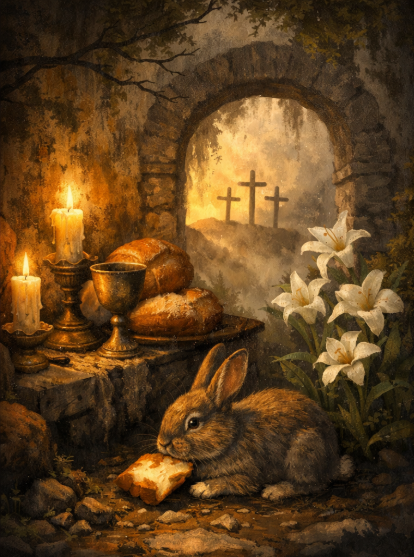 Easter has always carried two moods at once: light and shadow, resurrection and silence, lilies and lingering rain. Even in its brightest traditions, there is something quietly gothic in the image of dawn arriving at a stone once sealed, the air still cool, the world not yet fully awake. This small Easter reflection leans gently into that contrast—faith, old earth, and even a rabbit with questionable intentions.