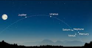 Around that date, six planets — Mercury, Venus, Saturn, Jupiter, Uranus, and Neptune — will appear along the evening sky shortly after sunset. They will not form a perfect line, nor a tight cluster, but a wide arc tracing the Sun’s familiar path across the heavens.