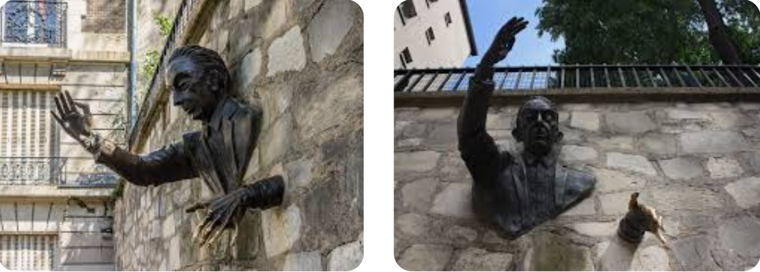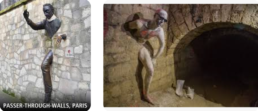 Deep beneath Paris, where skulls whisper and tunnels twist, lies this uncanny sculpture, inspired by Marcel Aymé’s 1941 short story. In it, Dutilleul, a Montmartre clerk, discovers he can walk through walls after a power outage alters his being. At first, he ignores this gift, but a cruel boss drives him to mischief—haunting offices, robbing banks, even seducing a lover. Yet, fate turns cruel: a doctor’s pills thicken his form, and he becomes entombed mid-passage on rue Norvins, his power lost forever. This tale, woven during wartime shadows, birthed a figure of gothic dread.