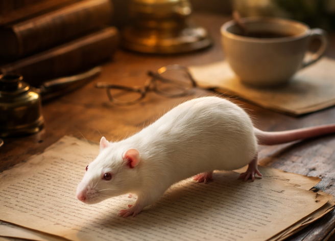 The image stayed because of its clarity. The tail was long — perhaps six inches, pale pink against the dark line of the desk — and the body nearly as long, large enough that there was no mistaking it for a mouse. Its whiteness was what gave it weight. A common creature made uncommon by color, stripped of the shadows one expects from such things. In waking life, white creatures always seem to arrive carrying a different atmosphere, as though nature itself has rewritten an ordinary form and asked us to look again.